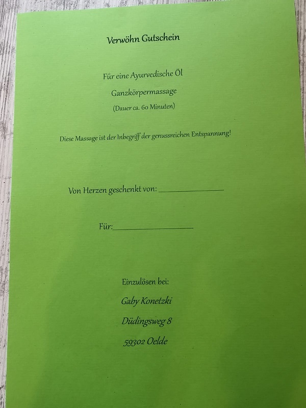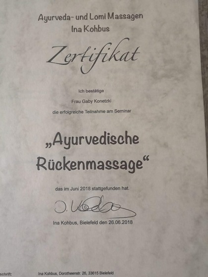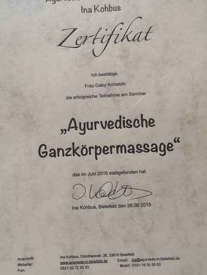 In 2015 habe ich während einer Ausbildung zur Yoga-Lehrerin meine Leidenschaft für die ayurvedische Massage entdeckt. In 2018 absolvierten Seminaren, habe ich mich professionell mit den Abhyanga-Techniken vertraut gemacht und wende sie seit dieser Zeit an.